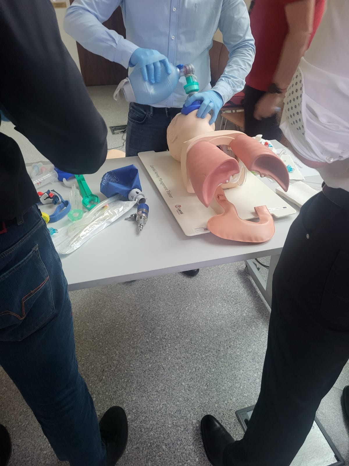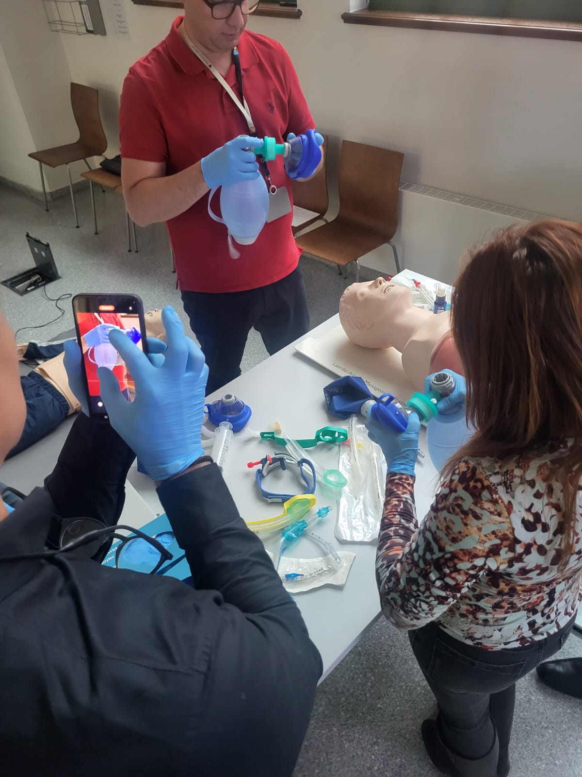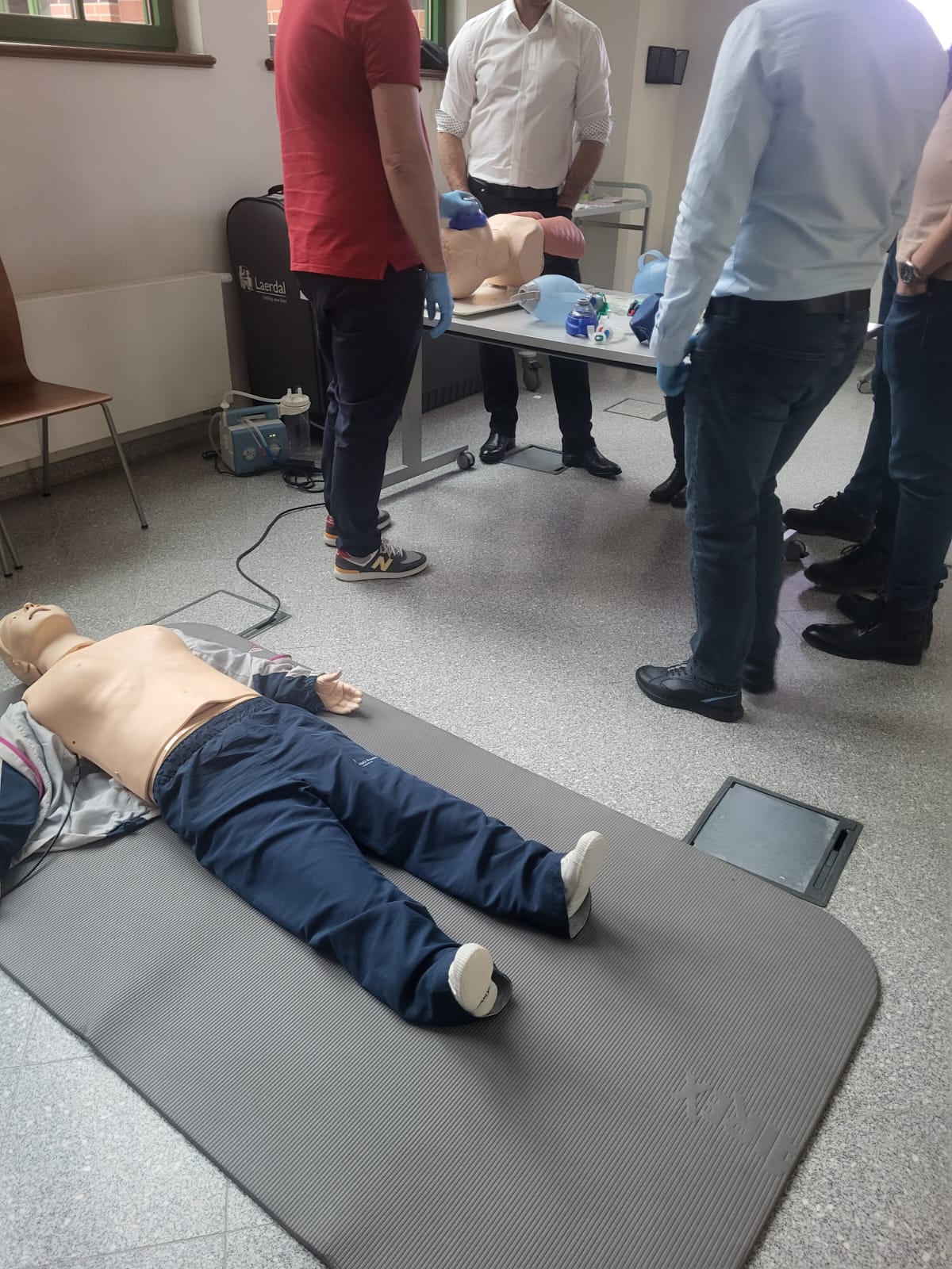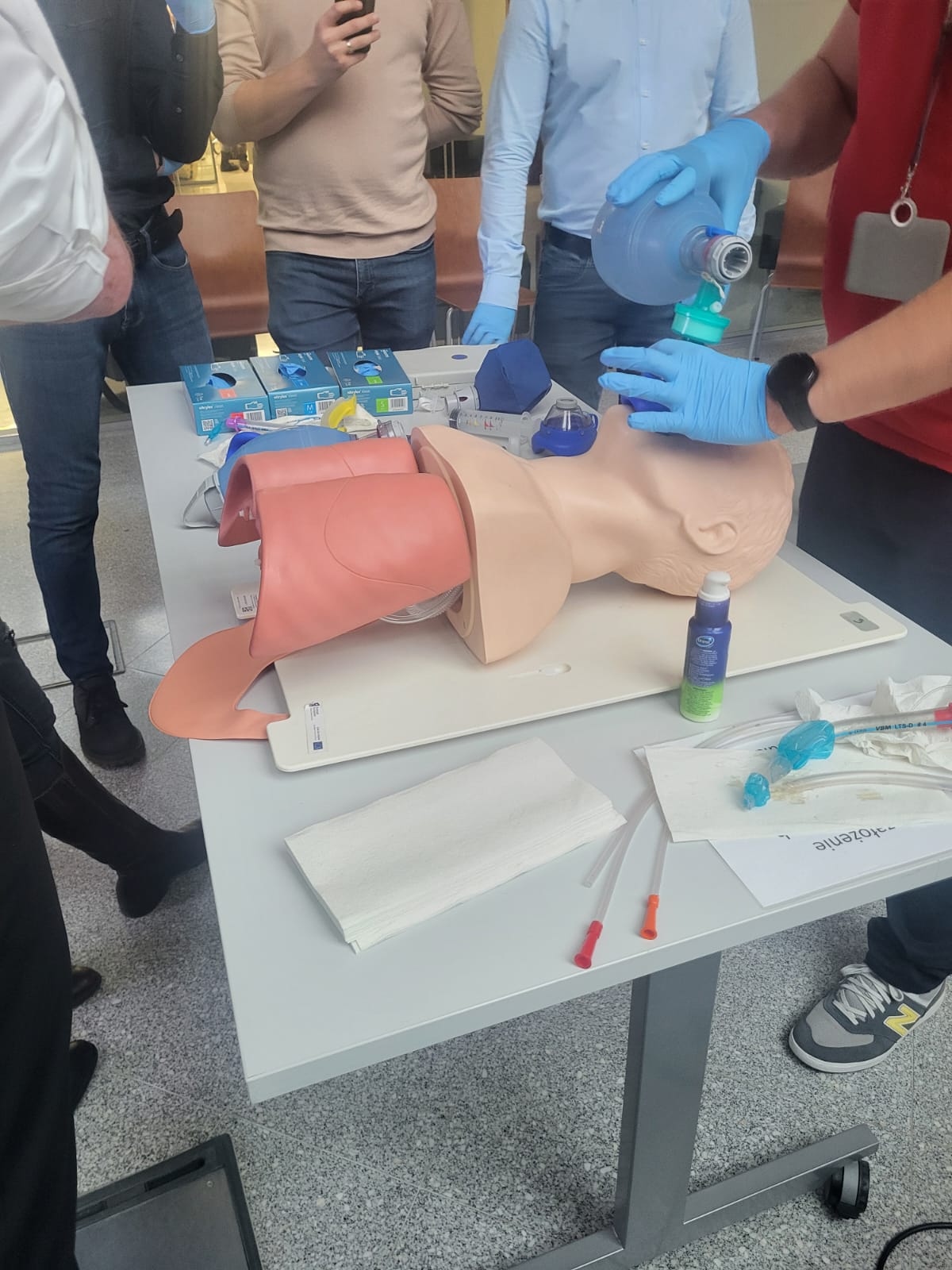 Następnie odbyły się zajęcia praktyczne dotyczące stanów nagłych w gabinecie związanych z udrożnieniem dróg oddechowych i wentylacji pacjenta, dostępu naczyniowego i farmakoterapii oraz nagłego zatrzymania krążenia , które zgodził się poprowadzić dr Paweł Gawłowski z Centrum Symulacji Medycznej UMW oraz mgr Aleksander Mickiewicz z Katedry Ratownictwa Medycznego UMW Centrum Symulacji Medycznej z Wrocławia.